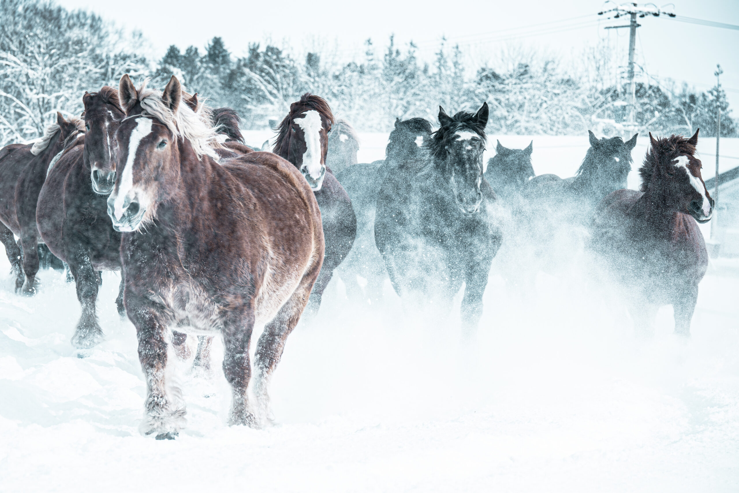 偶然にも前日にサラサラした雪が降っており、雪煙を上げながら走る馬たちの姿を捉えることができました。近年は温暖化の影響か、十勝もかなりの小雪傾向です。降ったとしてもベタ雪も多く、この日は本当にラッキーでした。