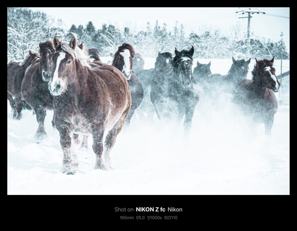 全体的にハイキーな仕上がりですが、右側の雪煙が白く飛んでしまい馬の輪郭がやや不明瞭になっています。現像時にハイライトを抑え、馬の顔や胴体の陰影を強調することで奥行きと立体感が増します。
