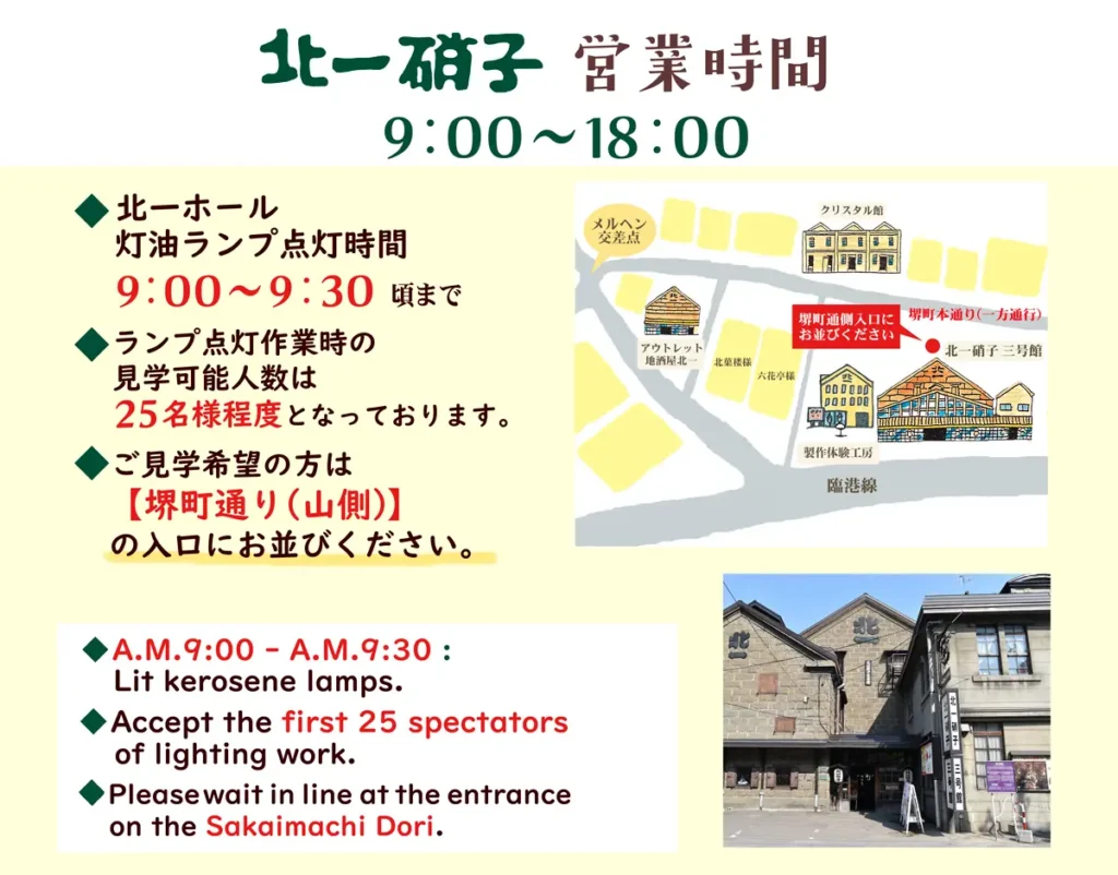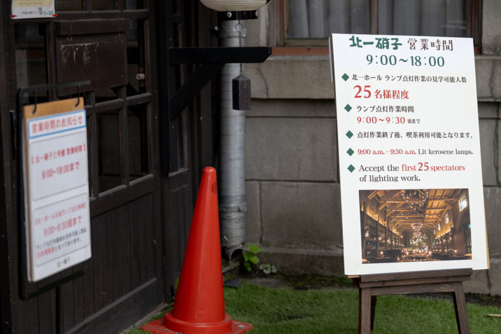 境町本通りに位置する北一硝子のホールでは、開店前の時間にランプの点灯作業を見ることができます。この記事では実際に撮影した写真とともに、現地の雰囲気や到着時間の目安をご紹介します。