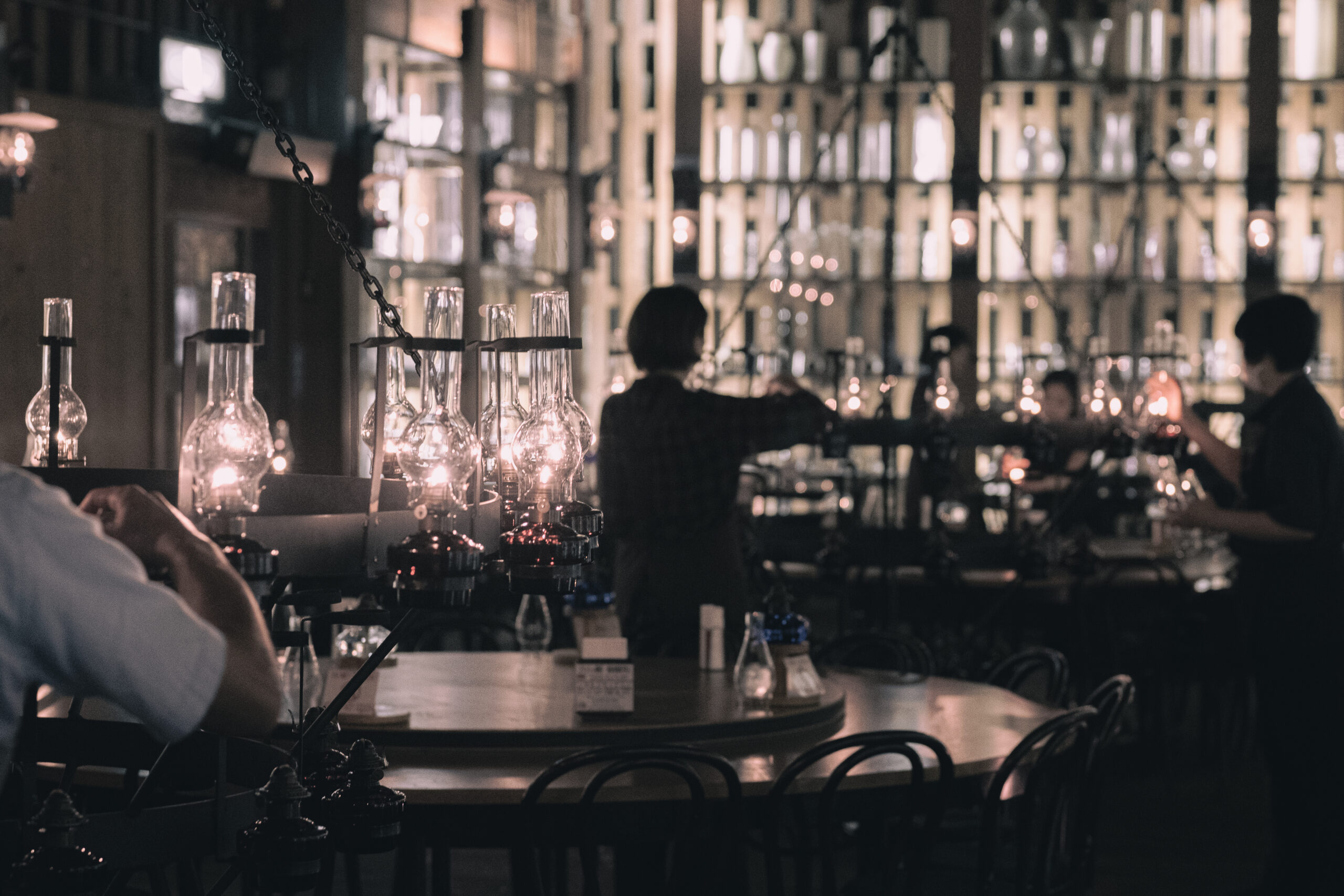 シャンデリアが終わると、テーブルのランプにも次々と点火していきます。柔らかなランプの光がホールを照らしていきます。棚のガラスにも光が反射して綺麗です。