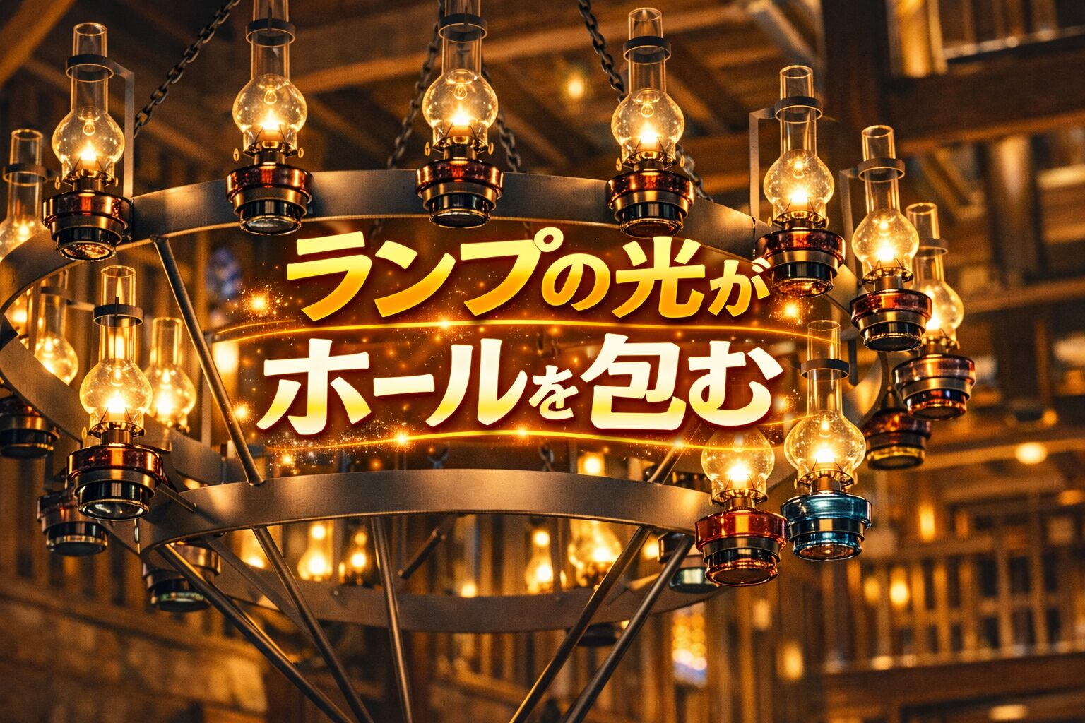 ホールに入ると、天井のシャンデリアが降りてきています。スタッフの方々がシャンデリアの湯壺に点火し、ガラスの筒(『ホヤ』というそうです)を被せていきます。しだいに辺りがランプの灯りと石油の匂いで満たされていきます。