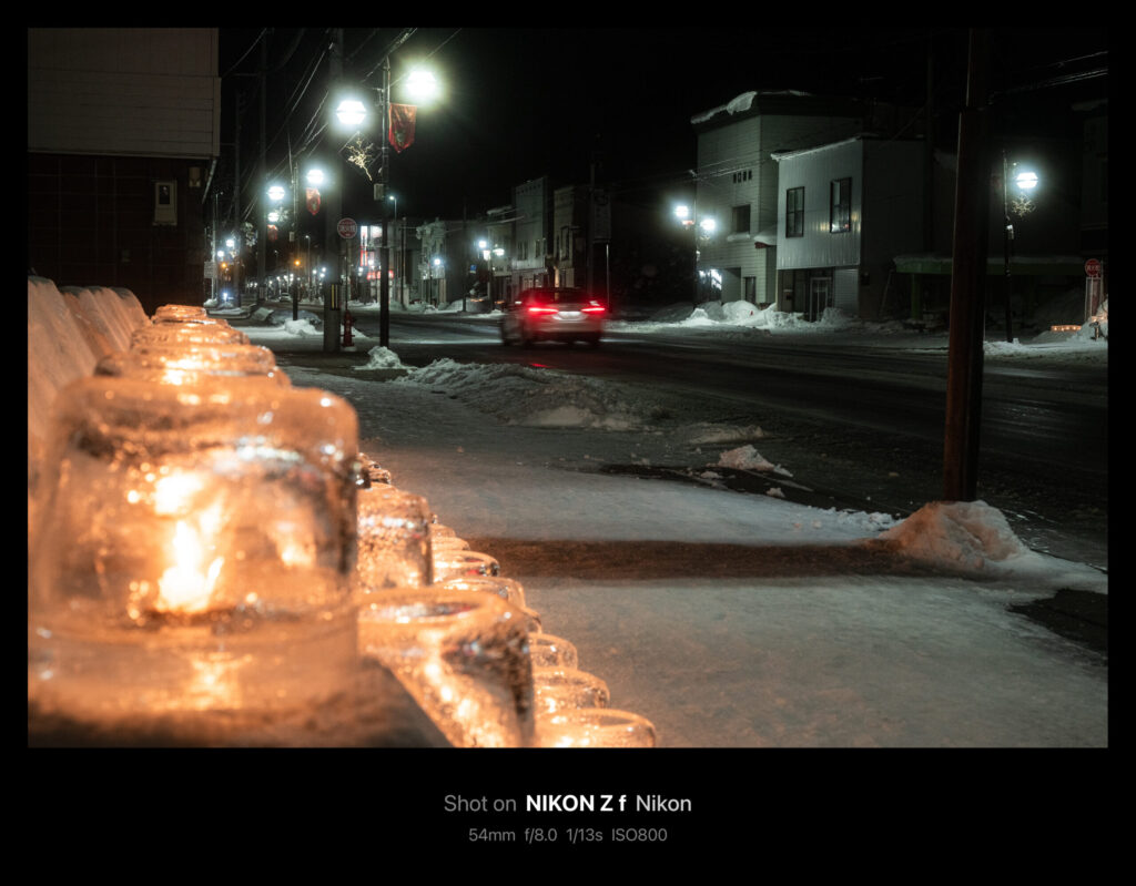 手前のアイスキャンドルの存在感がボケすぎないよう、かつ手持ちで何とか撮影できる塩梅を探りF値を8に設定。視線が手前→奥に抜けるようにしたかったので、車が画面に入るのを待ちます。何枚か撮ったところで、シャッタースピードは止めすぎないのが良さそうだとの結論に至り、結局1/13に。半端なSSになっているのは横着してAモード(絞り優先)のままISO感度を触って間接的にSSを調整したからです。