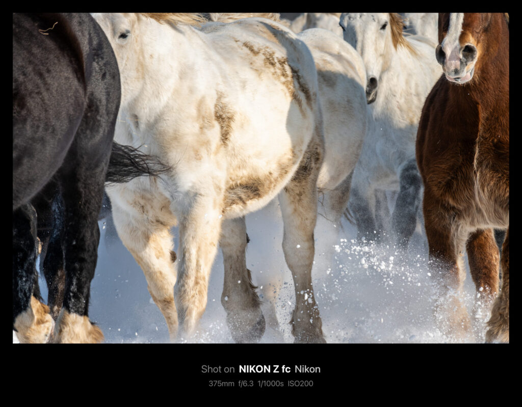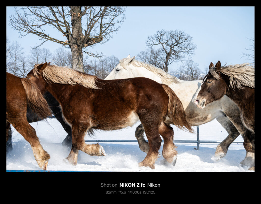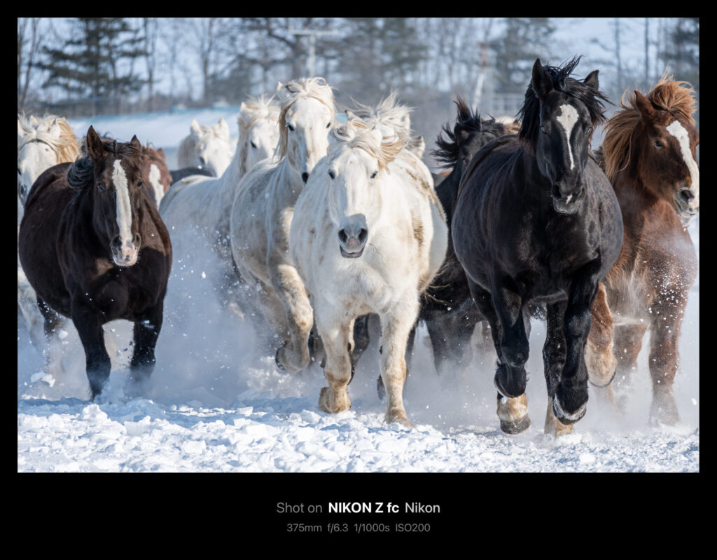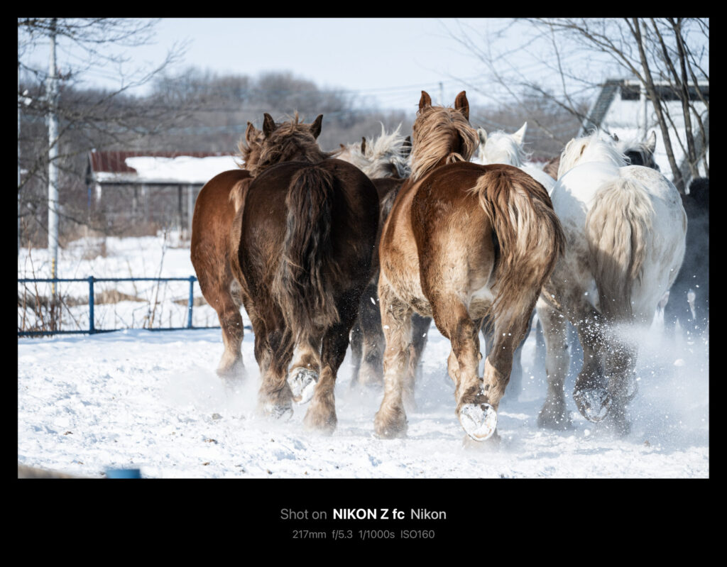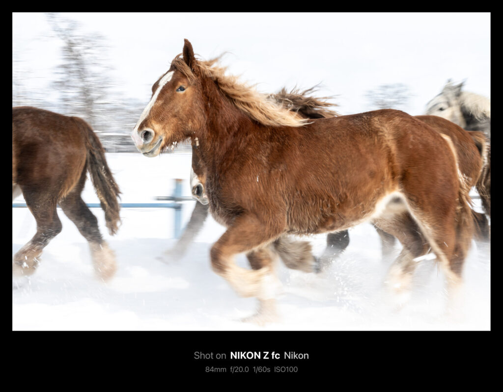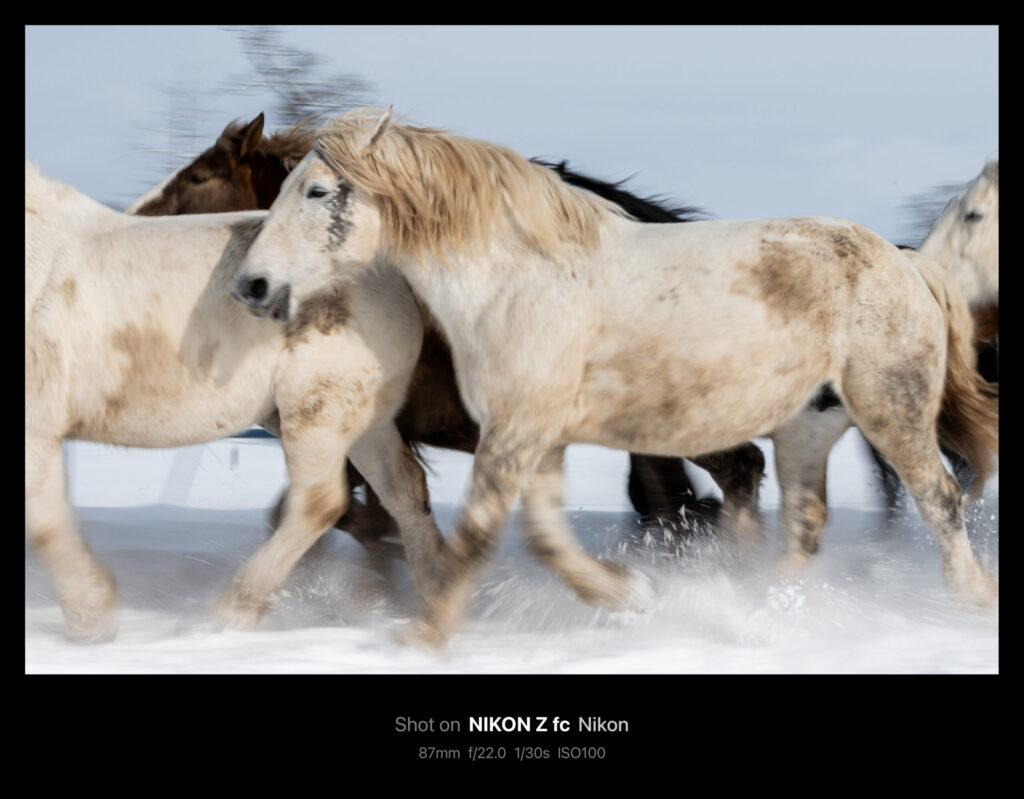 被写体が大きく速さはそれなりなので、シャッタースピードを1/60や1/30秒にして流し気味に撮っても迫力があります。このときはシャッタースピード優先・NDフィルター無しで撮ったので、F値が爆上がりしました。雪景色なので多少は白飛びしても成立します。