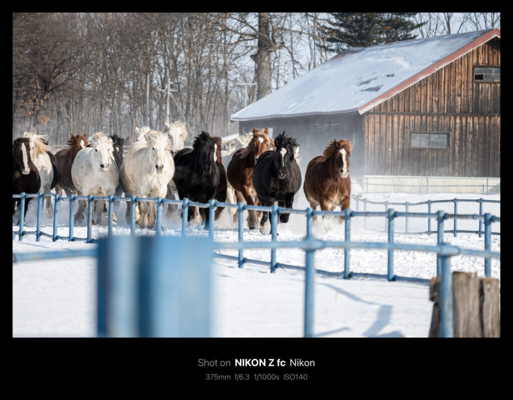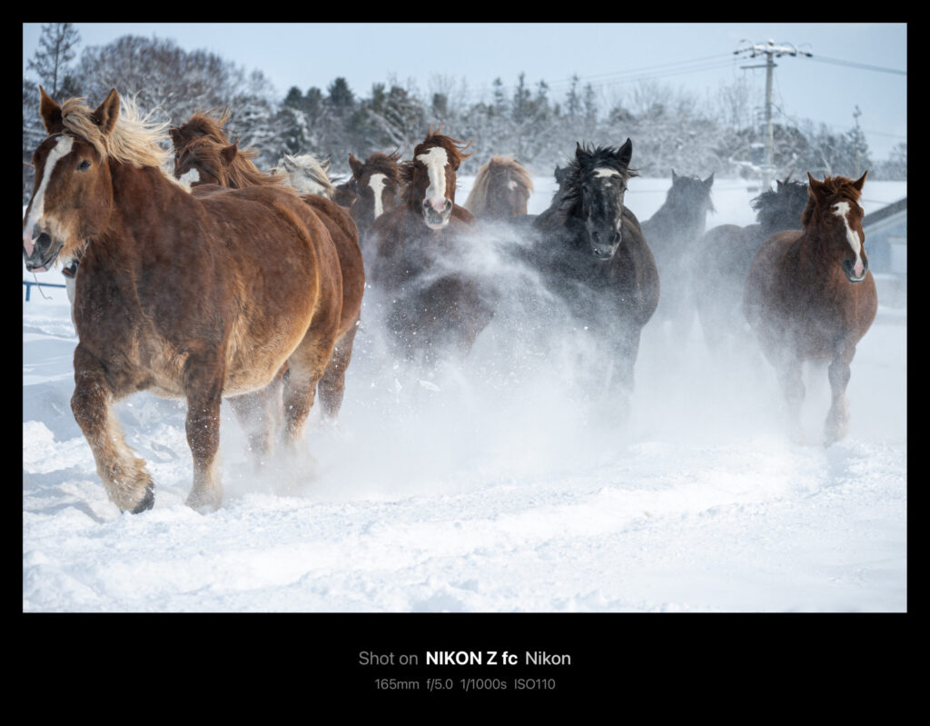 十勝牧場の馬追い運動は例年1月下旬から約1ヶ月、土日祝日を除く平日朝に毎日公開されています。サラブレッドの倍ほどの大きさの馬たちが雪煙をあげながら走る姿はまさに圧巻です。