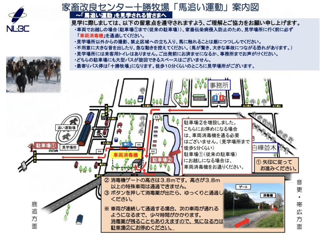 車で十勝牧場を訪れる際は、見学場所付近の消毒機ゲートを必ず通過しましょう。地図だとちょっと分かりにくいかもしれませんが、現地は案内板もあるのでさほど迷わず到着できると思います。